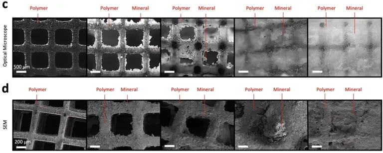 Researchers at the University of Southern California used 3D printers to create coral-inspired scaffolds, which they then coated with a conductive material and connected to an electronic circuit. When submerged in a calcium chloride solution and exposed to carbon dioxide, the scaffolding “grew” a carbon-dense coating and filled in the scaffold’s gaps.